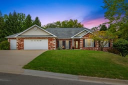 This thoughtfully designed ranch home delivers exceptional accessibility, quality construction, and effortless living on a beautifully landscaped half-acre lot. Step-free entry, many 36-inch doors throughout, an elevator, and whole-house generator ensure comfort and peace of mind for any lifestyle. A covered entry welcomes you inside, with an office/den to the right and formal dining room to the left. The spacious living room flows straight ahead to a sliding door opening onto a partially covered patio. Two bedrooms and a full bath anchor the right wing, while an open-concept layout connects the living room, dining area, and kitchen—which loops back to the formal dining space. Adjacent to the dining room, a generous primary suite features a sitting area, walk-in closet, patio access, and a spa-like bath with double sinks, jetted tub, and separate shower. Just off the kitchen area you will find convenient access to the laundry area, elevator, and three-car garage. Downstairs, the walk-out lower level offers a family room with gas fireplace, patio access, a fourth bedroom, three-quarter bath, and abundant utility storage. Homes combining this level of thoughtful design with functional excellence are rare—schedule your showing today.