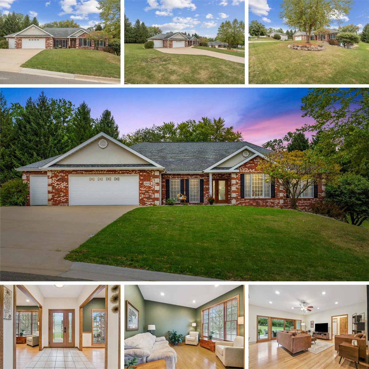 This thoughtfully designed ranch home delivers exceptional accessibility, quality construction, and effortless living on a beautifully landscaped half-acre lot. Step-free entry, many 36-inch doors throughout, an elevator, and whole-house generator ensure comfort and peace of mind for any lifestyle. A covered entry welcomes you inside, with an office/den to the right and formal dining room to the left. The spacious living room flows straight ahead to a sliding door opening onto a partially covered patio. Two bedrooms and a full bath anchor the right wing, while an open-concept layout connects the living room, dining area, and kitchen—which loops back to the formal dining space. Adjacent to the dining room, a generous primary suite features a sitting area, walk-in closet, patio access, and a spa-like bath with double sinks, jetted tub, and separate shower. Just off the kitchen area you will find convenient access to the laundry area, elevator, and three-car garage. Downstairs, the walk-out lower level offers a family room with gas fireplace, patio access, a fourth bedroom, three-quarter bath, and abundant utility storage. Homes combining this level of thoughtful design with functional excellence are rare—schedule your showing today.