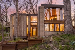 Acreage & Architecturally distinctive contemporary home nestled among mature trees, featuring bold geometric lines, concrete block construction, and expansive windows that frame wooded views. Multi-level decks, dramatic ceiling heights, and a striking spiral staircase create visual interest throughout, while warm wood elements balance the modern design with natural character.