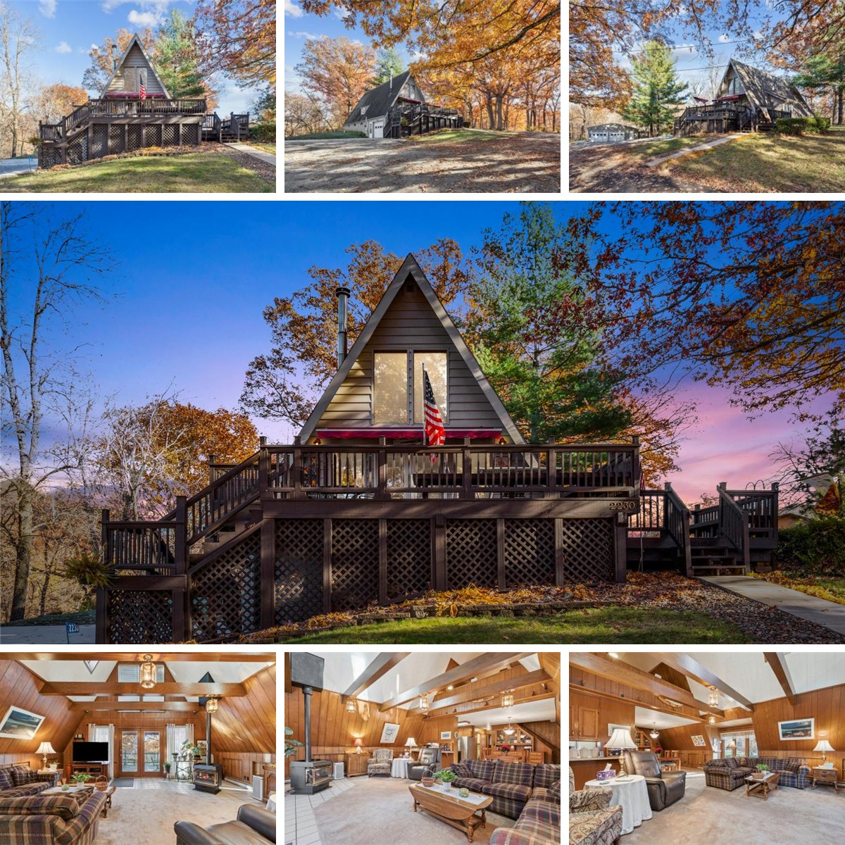 Make this stunning lake home your year-round retreat! Nestled in the woods, this classic A-frame blends rustic charm with modern comfort. Step onto the beautifully maintained deck and feel the peace that surrounds you. Inside, the spacious living room features warm wood beams, soaring vaulted ceilings, and a cozy gas stove—perfect for cool evenings. The kitchen shines with original woodwork and updated appliances, and the formal dining room offers built-ins for extra storage. The main floor includes a full bath and a large primary bedroom with plenty of closet space and a private back deck. Upstairs, enjoy a versatile loft and a second bedroom with its own balcony overlooking the trees. The lower level adds even more living space with a recreation room, vintage bar, full bath, laundry, and bonus room. Outside, you'll find an extra-deep garage with a new concrete drive and a 26x30 outbuilding for all your lake toys. Don’t wait—schedule your showing today and make this lake home yours!