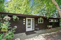 Incredibly unique mid-century home filled with light & surrounded by nature. Not your everyday ranch home, this property offers space to relax, entertain, and use your creativity in each room. Entry leads in to a sitting nook, with large windows and a storage/coat closet adjacent. The kitchen & dining space feels airy with the vaulted ceilings & white-painted beams overhead. Modern kitchen with sleek cabinetry & open shelves offers room for guests to cook & mingle. Step up a few stairs to the spacious rooftop deck to enjoy the cool shade during the day or string up some lights for evening gatherings. 2 bedrooms on the main level, both with large windows looking to the trees. Main bath with new vanity & subway tiled shower. Lower level living room has a wood burning stove, hardwood floors, and huge windows. 2 more bedrooms on the lower level, 1 with an attached bath. Outside, lots of opportunity to make the landscaping your own, with large tiered planter beds out front and wooded areas all around. Large storage shed under the living room for garden tools & a workshop. Come look & fall in love!