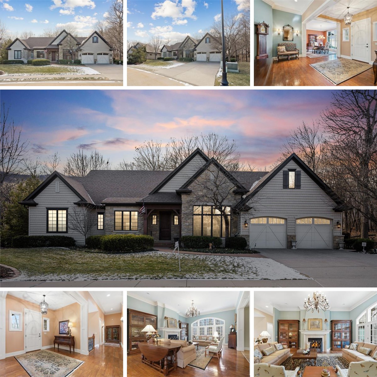 LUXURY MEETS COMFORT in this impeccably designed walk out ranch offering refined finishes, generous living spaces, and a serene wooded backdrop. Enjoy privacy and low maintenance living with landscaping and snow removal included through the HOA, allowing you to focus on living, not upkeep.From the moment you step inside, you will appreciate the soaring 10 to 12 ft ceilings, double layered crown molding, and coffered ceilings in the office, creating an elevated architectural presence throughout. Engineered hardwood floors flow across most of the main level, complemented by tile in the kitchen. The inviting living room is centered around a gas fireplace, ideal for both everyday comfort and entertaining. The chef inspired kitchen is designed to impress, featuring granite countertops, custom cabinetry with soft close doors and full extension drawers, pull out shelving, under cabinet lighting, pot filler, prep sink, breakfast bar, and a spacious island. High end appliances showcasing the integrated refrigerator and a butler's pantry with additional cabinet and counter space, making this kitchen as functional as it is beautiful. The main level primary suite offers a private retreat with generous proportions and a spa like atmosphere. Step out onto the private deck overlooking the landscaped and fenced backyard with peaceful wooded views, an ideal setting for morning coffee or evening relaxation. The finished walk out lower level expands the living space with a second fireplace, recreation room, two bedrooms each with access to full bathrooms. A secondary kitchenette that features a custom antique bar with dishwasher, beverage refrigerator, and prep sink that adds flexibility for guests, entertaining, or extended living arrangements. Schedule your private showing today and discover why this home stands apart from the others on your list.