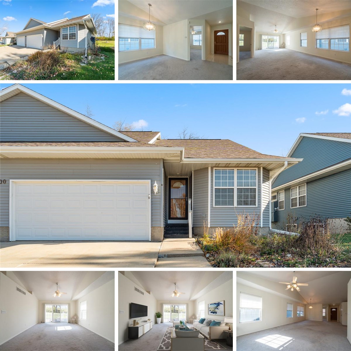 Beautifully updated, freshly painted 4-bedroom ranch-style condo with convenient access to Hwy 100 and Hwy 13. Charming flower beds welcome you to this open-concept home, vaulted ceilings and abundant natural light. The spacious living and dining areas flow seamlessly into the kitchen, featuring white cabinetry, black quartz countertops, a tile backsplash, breakfast bar, and new dishwasher and refrigerator. The main suite retreat offers vaulted ceilings, a large walk-in closet, and a beautifully updated bathroom with porcelain tile floor and a dual vanity. Additional highlights are the first-floor laundry. The lower level is brightened by daylight windows and offers a family room with a gas fireplace surrounded by tile, two generous bedrooms, and a full bath. Step outside to the maintenance-free deck and enjoy the privacy and peaceful wooded views. New garage door and front door. Low HOA fees.